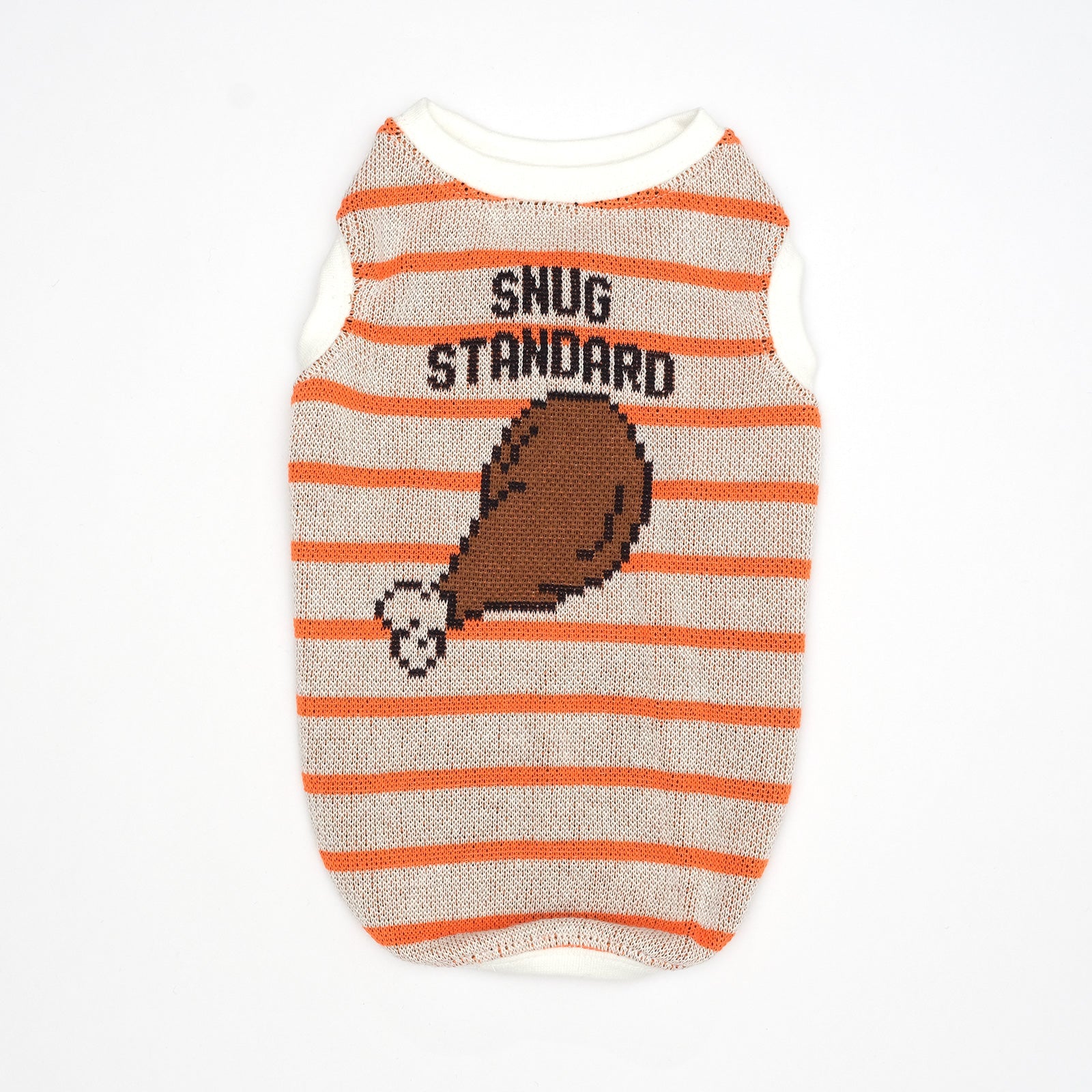 SNUG STANDARDオリジナルテキスタイルのタンクトップ。SNUG STANDARDオリジナル編み図で織地生産から縫製までメイドインジャパンのスペシャルな一枚。ブリリアントカラーのボーダーに骨付きローストチキンをデザインしました。おっきなお肉をひとりじめです。ポロシャツのような軽い生地で伸縮性もあり、通気性に優れていてサラサラとした爽やかな着心地になっています。